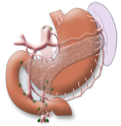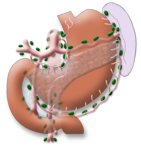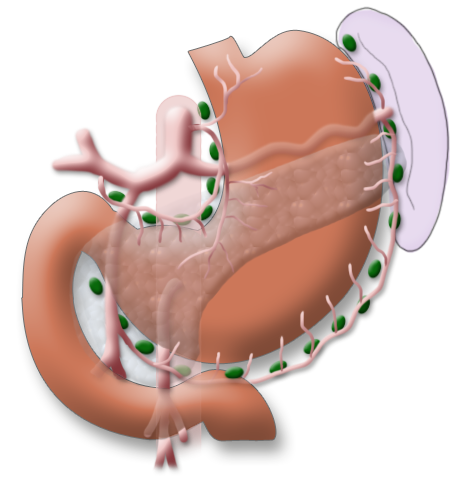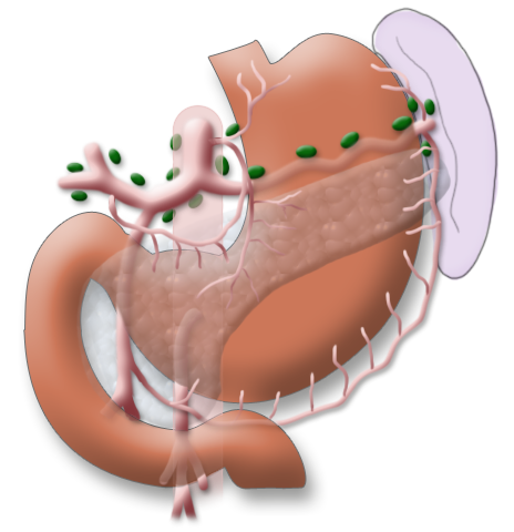 The gastrectomy is supplemented by removal of all lymph nodes directly surrounding the stomach (D1 segment) and along the truncus coeliacus, the hepatic artery, and the splenic artery (A. lienalis) (D2 segment). In Japan it is standard to perform an extended lymphadenectomy encompassing the D3 (DIII) segment.